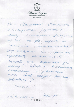 Большое спасибо за заботу о пожилой нашей бабушке. За Ваше терпение, благожелательность и заботу о слабых стариках. Наша семья признательна всему персоналу домика №5, замечательному повару, сиделкам-хозяйкам Жанне, Олесе и Анастасии, а также Ирине Анатольевне, управляющей «Альпийской деревни».