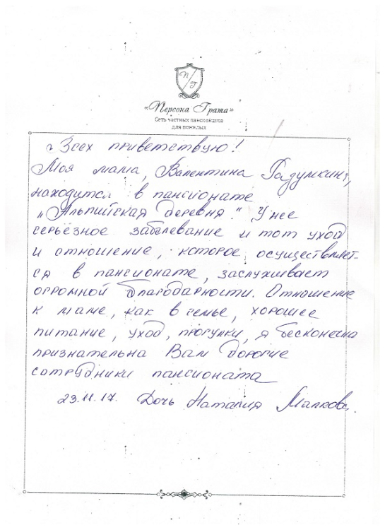 Моя мама, Валентина Разумкина, находится в пансионате «Альпийская деревня». У нее серьезное заболевание и тот уход и отношение, которое осуществляется в пансионате, заслуживает огромной благодарности. Отношение к маме, как в семье, хорошее питание, уход, прогулки, я бесконечно признательна Вам, дорогие сотрудники пансионата.