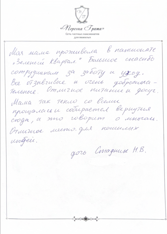 Моя мама проживала в пансионате «Зеленый Квартал».Большое спасибо сотрудникам за заботу и уход. Все отзывчивые и очень доброжелательные. Отличное питание и досуг. Мама так тепло со всеми прощалась и собирается вернуться сюда, а это говорит о многом. Отличное место для пожилых людей.