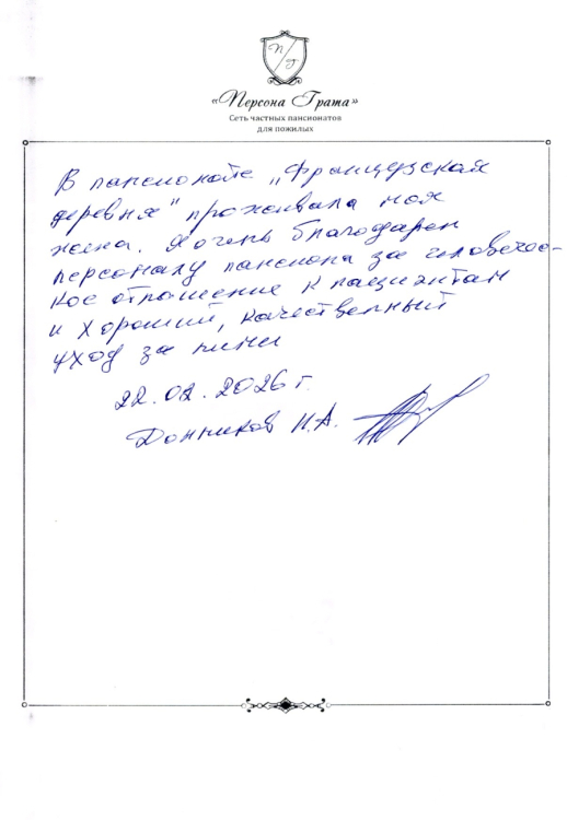В пансионате «Французская деревня» проживала моя жена. Я очень благодарен персоналу пансионата за человеческое отношение к пациентам и хороший, качественный уход за ними.
