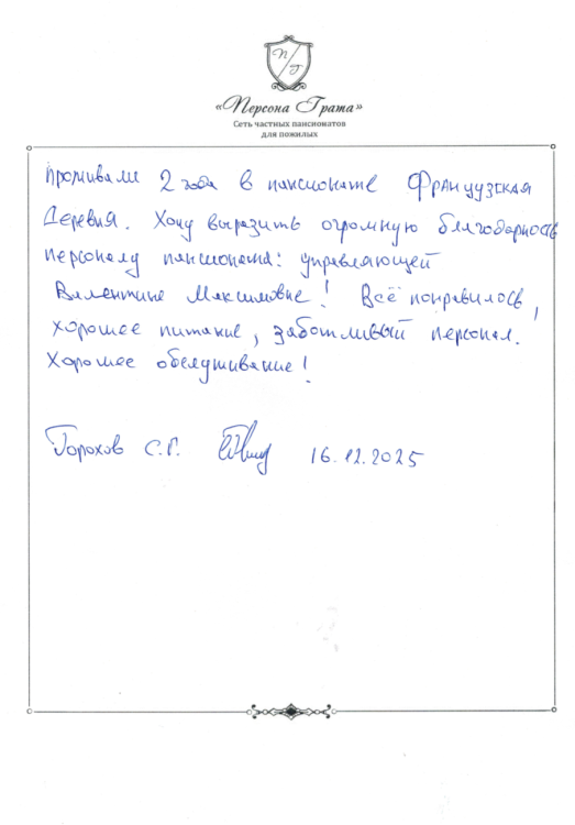 Проживали 2 года в пансионате Французская Деревня. Хочу выразить огромную благодарность персоналу пансионата:управляющей Валентине Максимовне! Все понравилось, хорошее питание, заботливый персонал. Хорошее обслуживание!