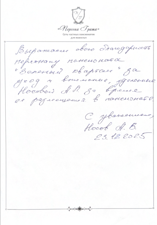 Выражаем свою благодарность персоналу пансионата «Зеленый квартал» за уход и внимание, уделенные Носовой А.Л. за время ее размещения в пансионате.
