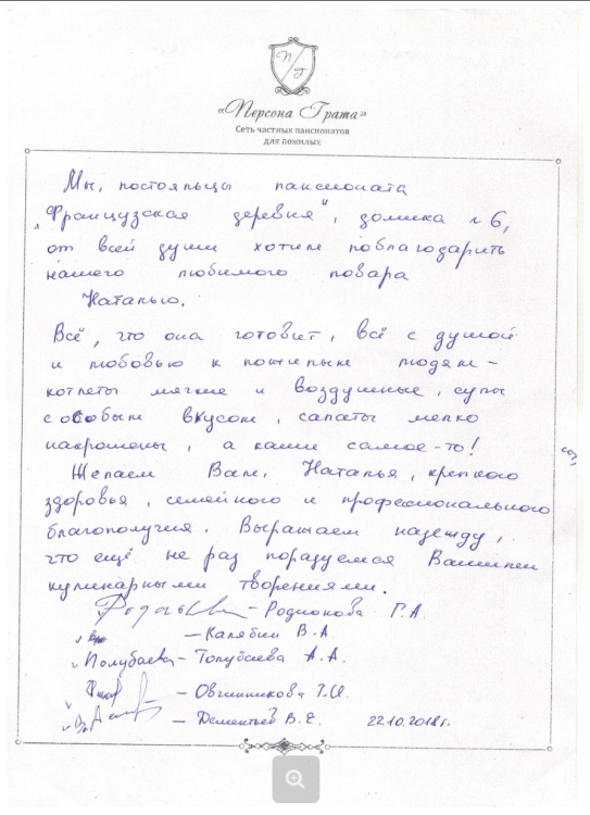 Мы, постояльцы пансионата «Французская деревня», домика №6, от всей души хотим поблагодарить нашего любимого повара Наталью.