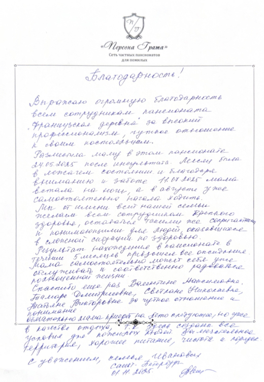 Выражаю огромную благодарность всем сотрудникам пансионата «Французская деревня» за высокий профессионализм, чуткое отношение к своим постояльцам.