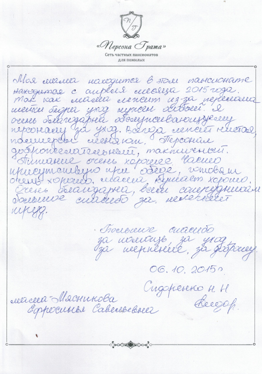 Моя мама находится в этом пансионате с апреля месяца 2015 года. Так как мама лежит из-за перелома шейки бедра, уход нужен особый. Я очень благодарна обслуживающему персоналу за уход. Всегда лежит чистая, памперсы меняют. Персонал доброжелательный, тактичный.