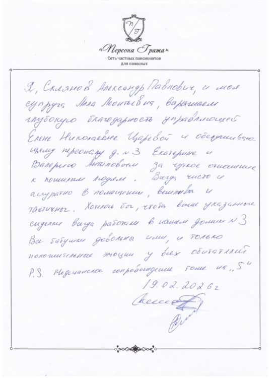 Я, Склянов Александр Павлович, и моя супруга, Алла Леонтьевна, выражаем глубокую благодарность управляющей Елене Николаевне Царевой и обслуживающему персоналу д.№3 Екатерине и Валерию Антиповым за чуткое отношение к пожилым людям, вежливы и тактичны. Хотелось бы, чтобы выше указанныесиделки всегда работали в нашем домике №3. Все бабушки довольны ими, и только положительные эмоции у всех обитателей.
