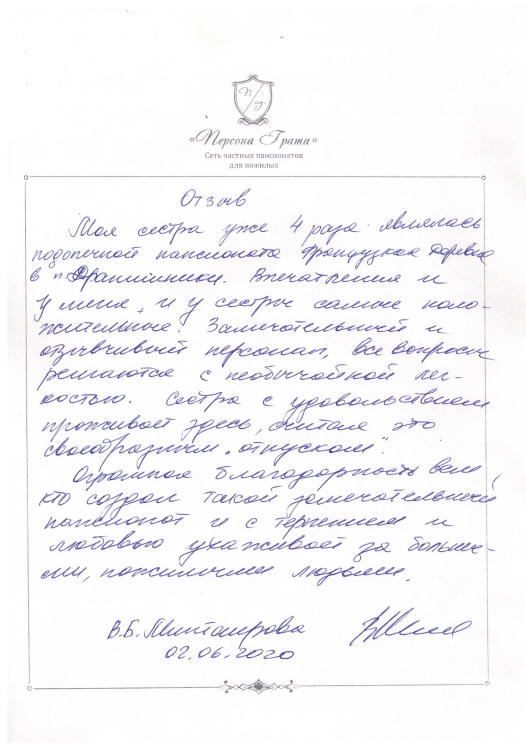 Огромная благодарность всем, кто создал такой замечательный пансионат, и с терпением и любовью ухаживает за больными, пожилыми людьми.