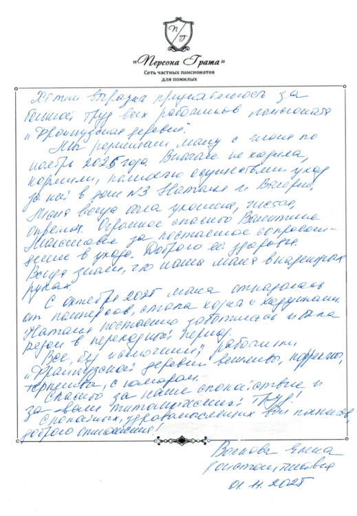 Мы размещали маму с июня по ноябрь 2025 года. Вначале не ходила, кормили, полностью осуществляли уход за ней в доме №3 Наталья и Валерий. Мама всегда была ухожена, чистая, опрятная. Огромное спасибо Валентине Максимовне за постоянное сопровождение в уходе. Доброго ей здоровья. Всегда знали, что наша мама в надежных руках.