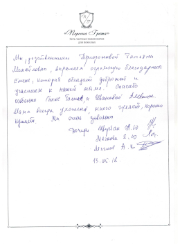 Выражаем благодарность и признательность всему коллективу предприятия за профессиональную помощь больным, пожилым людям. Выражаем особую благодарность Наташе – за все медицинские услуги и ее доброжелательность, с добрым отношением, помощью и чувством юмора, которое поддерживает дух, и желаем тебе, Наташенька, доброго здоровья.