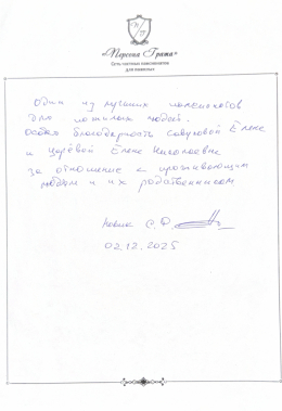 Большое спасибо за заботу о пожилой нашей бабушке. За Ваше терпение, благожелательность и заботу о слабых стариках. Наша семья признательна всему персоналу домика №5, замечательному повару, сиделкам-хозяйкам Жанне, Олесе и Анастасии, а также Ирине Анатольевне, управляющей «Альпийской деревни».